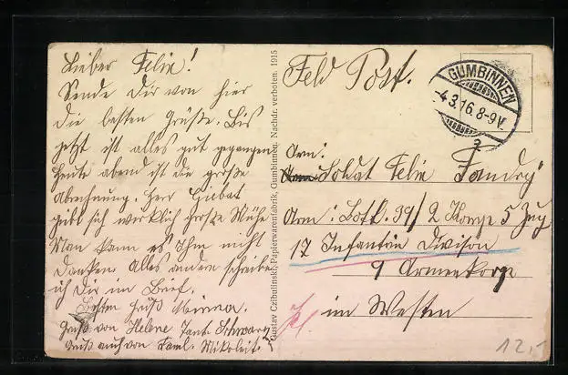 alte Ansichtskarte, gelaufen 1916 als Feldpost, Bugspur oben mittig, Eckknick re. unten, guter Zustand