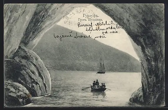 AK Gursuf, Bootsfahrt durch Felsenbogen mit Segelschiff im Hintergrund