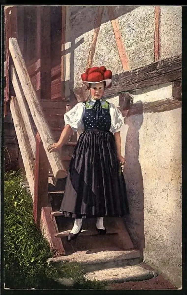 AK Gutach, Mädchen in badischer Tracht kommt eine Treppe herunter