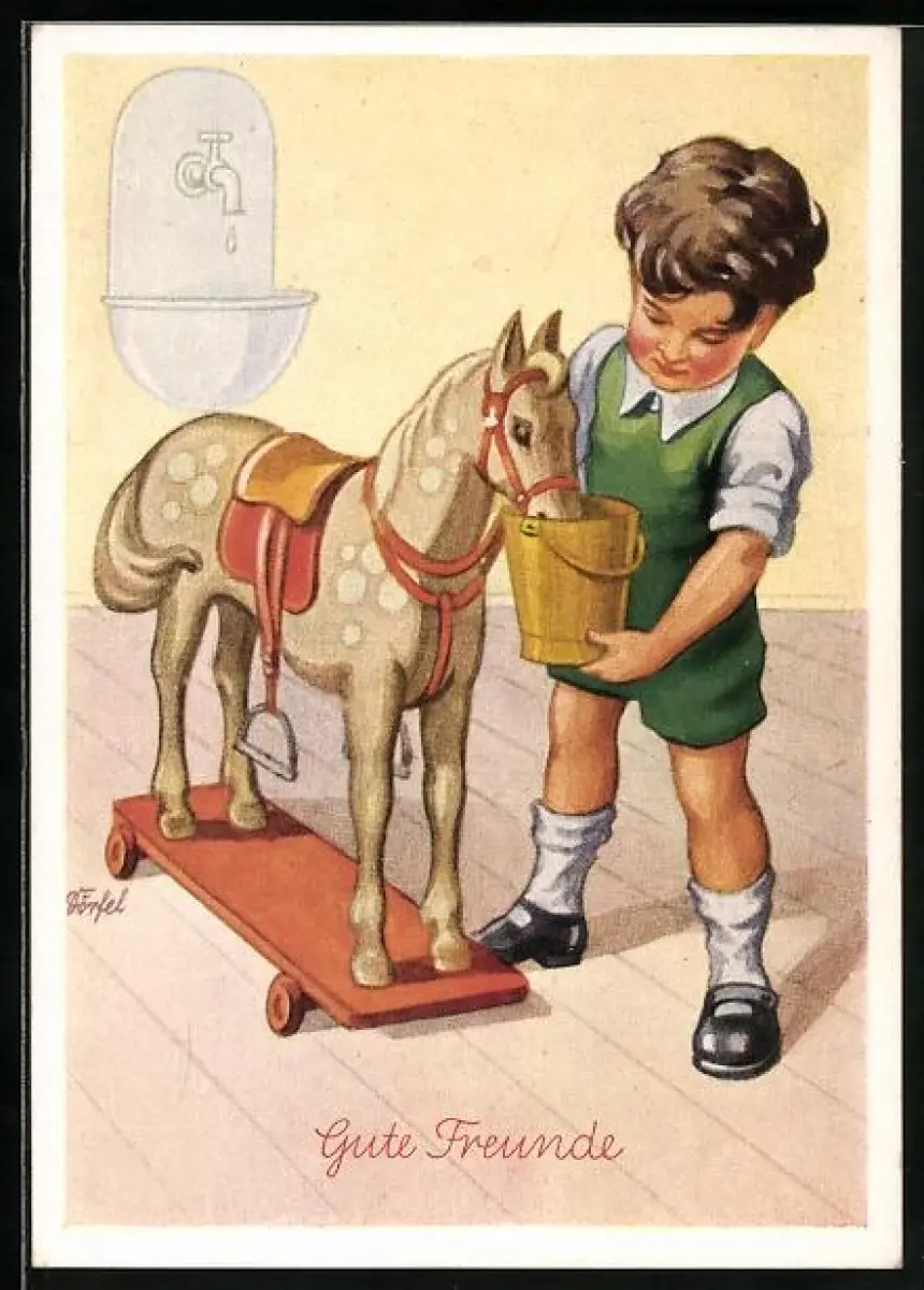 AK Gute Freunde, Junge füttert sein Schaukelpferd