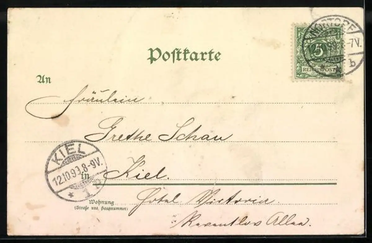 alte Ansichtskarte, gelaufen 1899, Einriss und Eckknick li. oben, Bugspur re.
