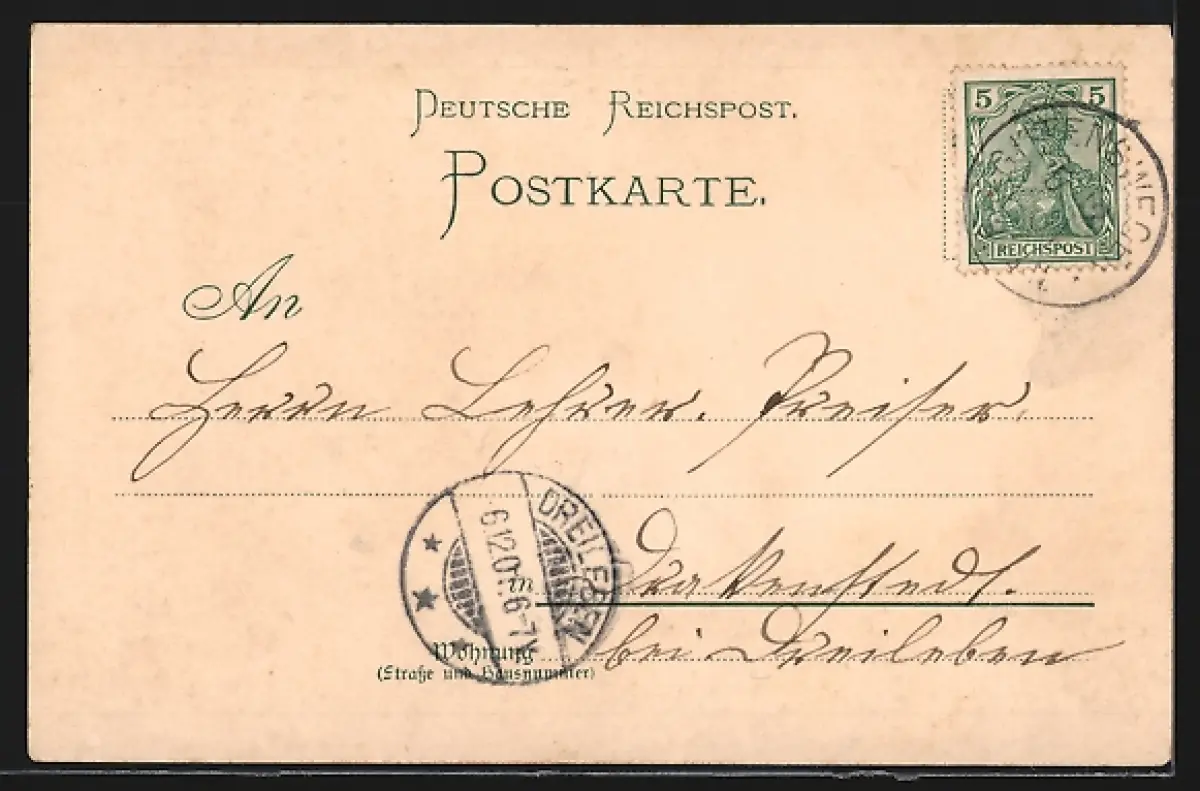 Personenbezogene Daten auf der Rückseite der Karte wurden durch blauen Textmarker unkenntlich gemacht. Die blauen Stellen sind auf die Vorderseite durchgeweicht und wirken sich negativ auf das Postkartenfoto aus