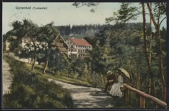 AK Gyrenbad bei Turbental, Ortsansicht hinter Paar auf einer Bank