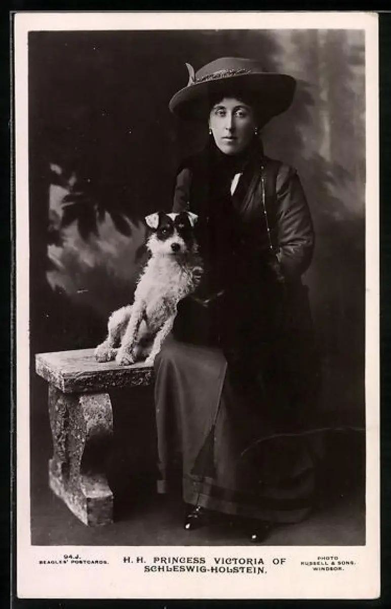 AK H. H. Princess Victoria of Schleswig-Holstein mit Hund auf Bank sitzend