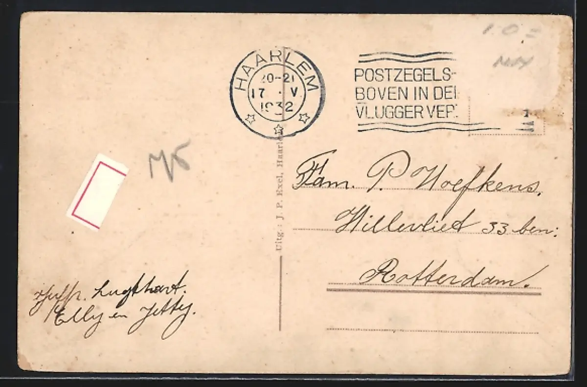 Personenbezogene Daten auf der Rückseite der Karte wurden durch blauen Textmarker unkenntlich gemacht. Die blauen Stellen sind auf die Vorderseite durchgeweicht und wirken sich negativ auf das Postkartenfoto aus