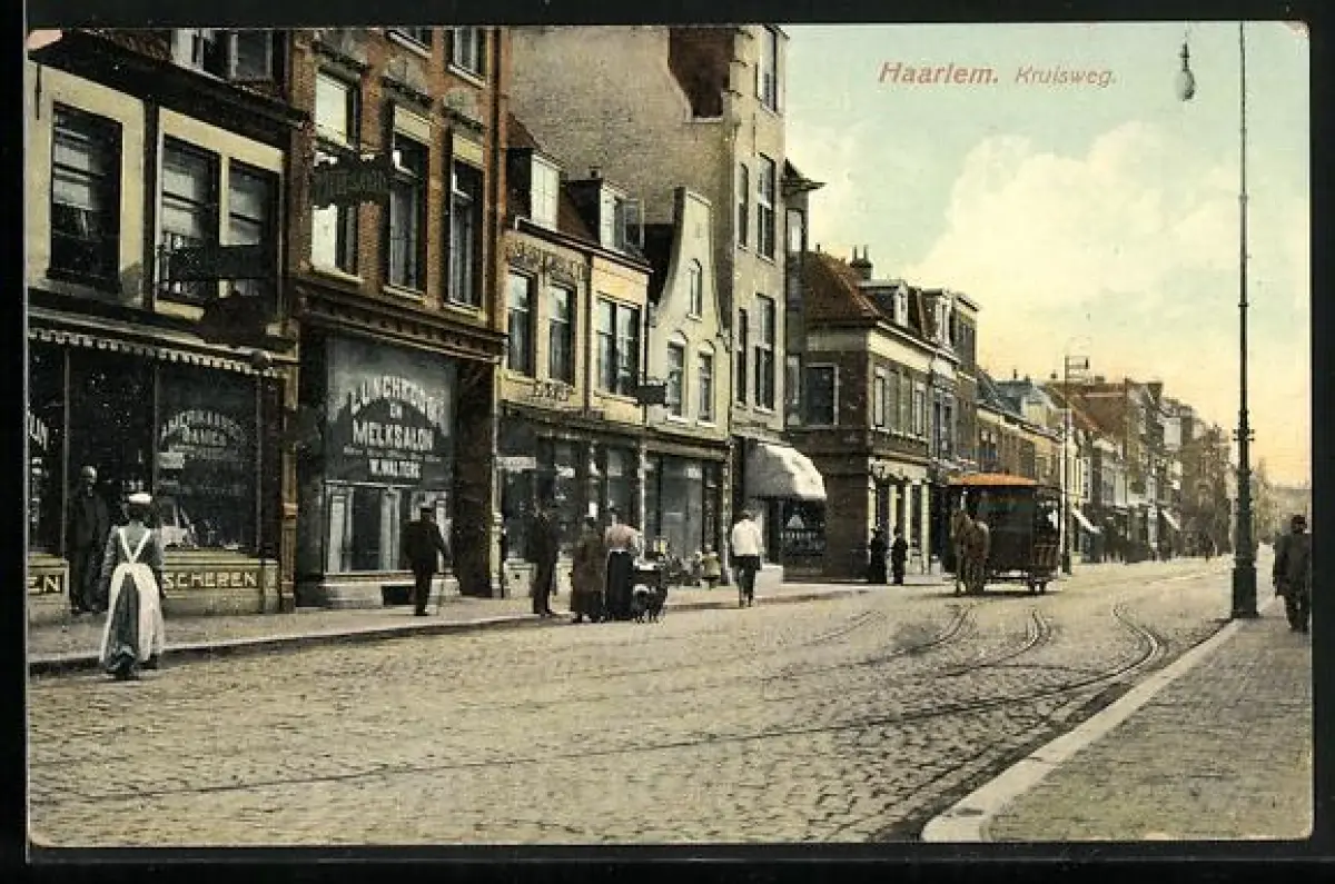 AK Haarlem, Kruisweg met winkels, Pferdebahn