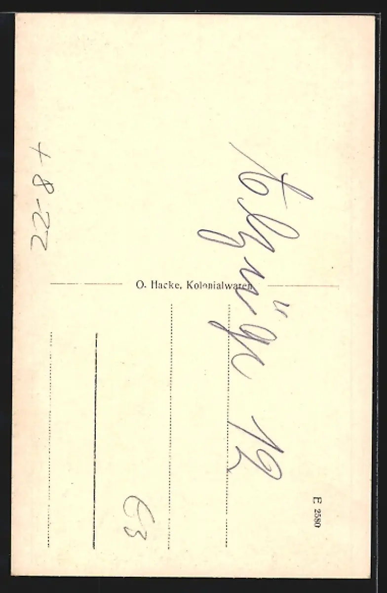 Personenbezogene Daten auf der Rückseite der Karte wurden durch blauen Textmarker unkenntlich gemacht. Die blauen Stellen sind auf die Vorderseite durchgeweicht und wirken sich negativ auf das Postkartenfoto aus