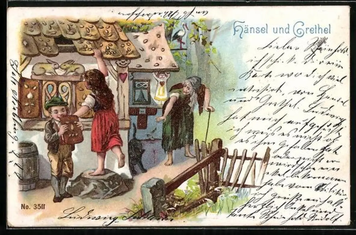 AK Hänsel und Gretel essen am Hexenhaus Lebkuchen