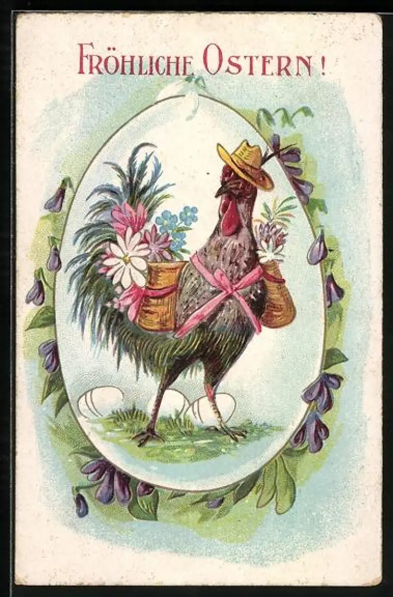AK Hahn mit Blumen auf einem Osterei