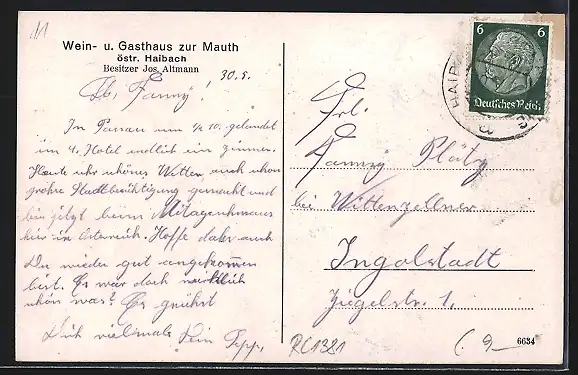 AK Haibach, Wein- und Gasthaus zur Mauth J. Altmann mit Umgebung und Strasse aus der Vogelschau
