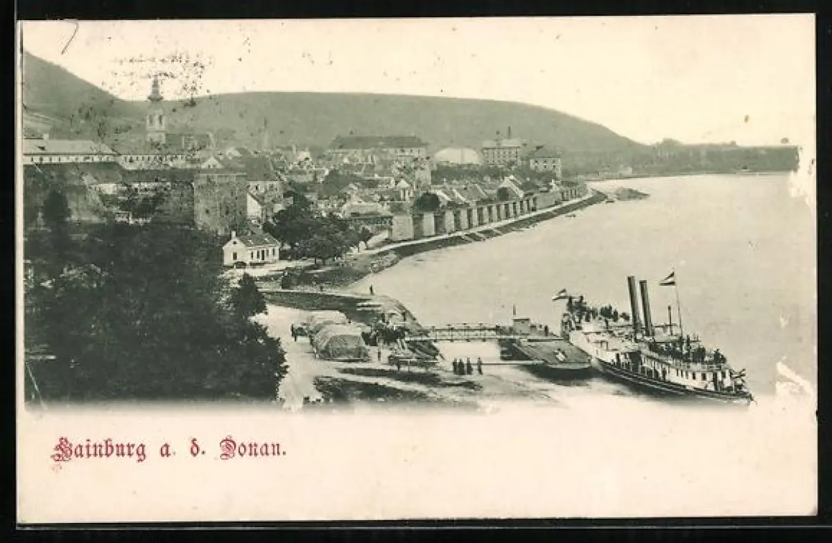 AK Hainburg a. d. Donau, Dampfer am Anleger, Blick auf den Ort