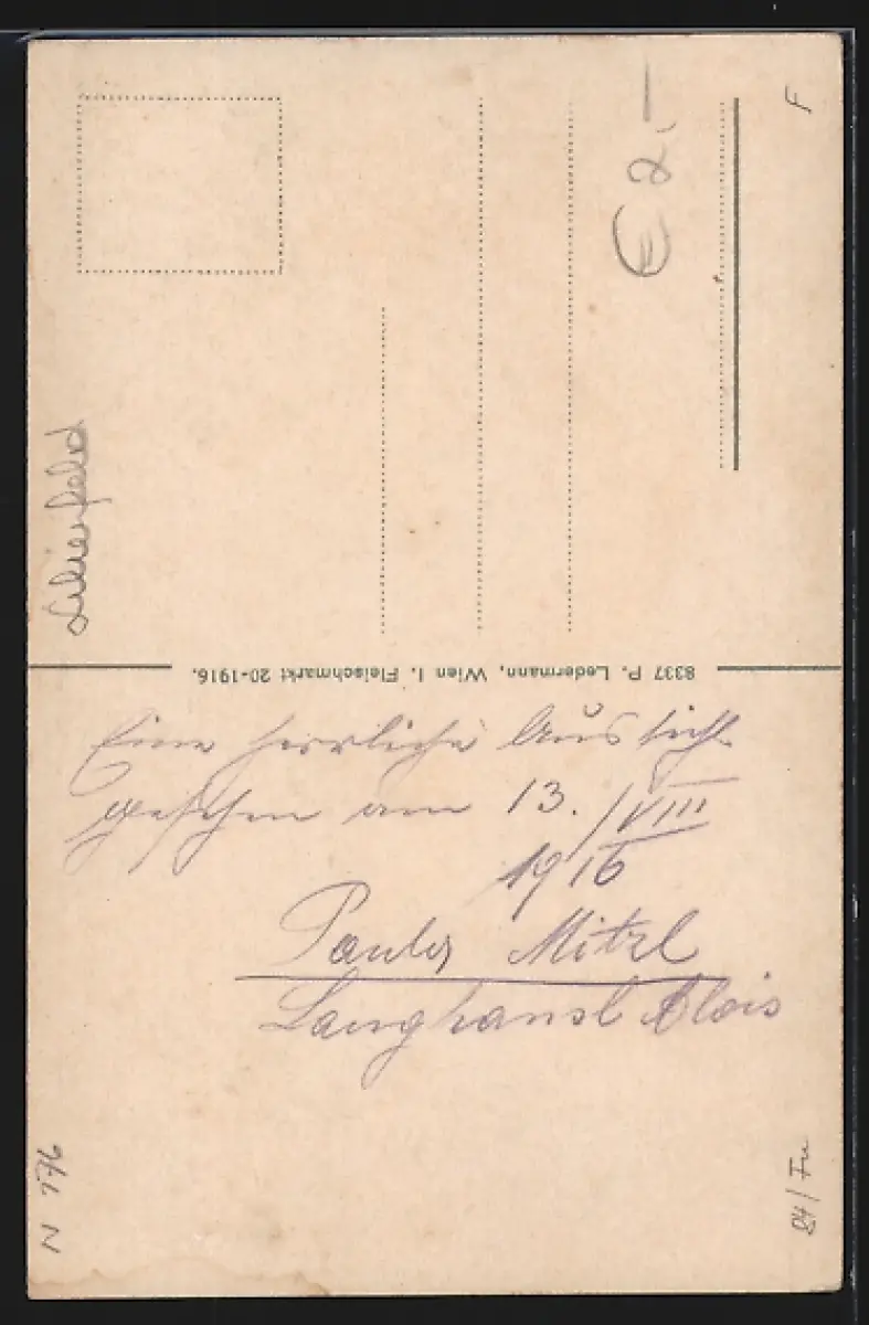 Personenbezogene Daten auf der Rückseite der Karte wurden durch blauen Textmarker unkenntlich gemacht. Die blauen Stellen sind auf die Vorderseite durchgeweicht und wirken sich negativ auf das Postkartenfoto aus