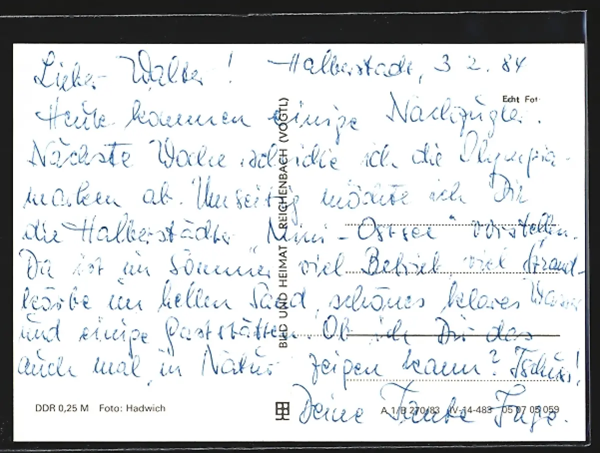 Personenbezogene Daten auf der Rückseite der Karte wurden durch blauen Textmarker unkenntlich gemacht. Die blauen Stellen sind auf die Vorderseite durchgeweicht und wirken sich negativ auf das Postkartenfoto aus