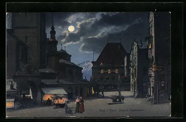 AK Hall, Oberer Stadtplatz mit Brunnen