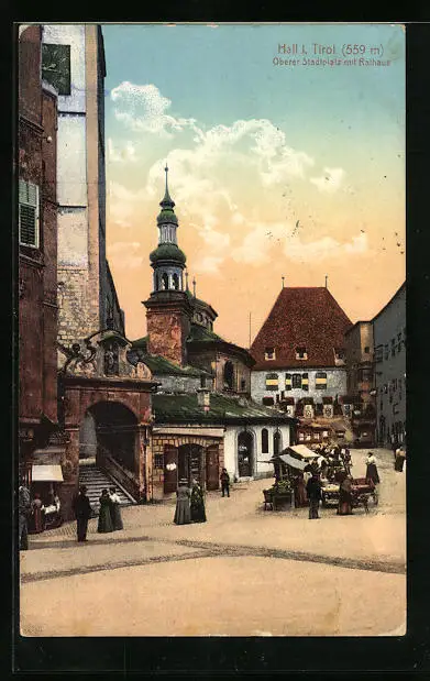 AK Hall, Oberer Stadtplatz mit Rathaus