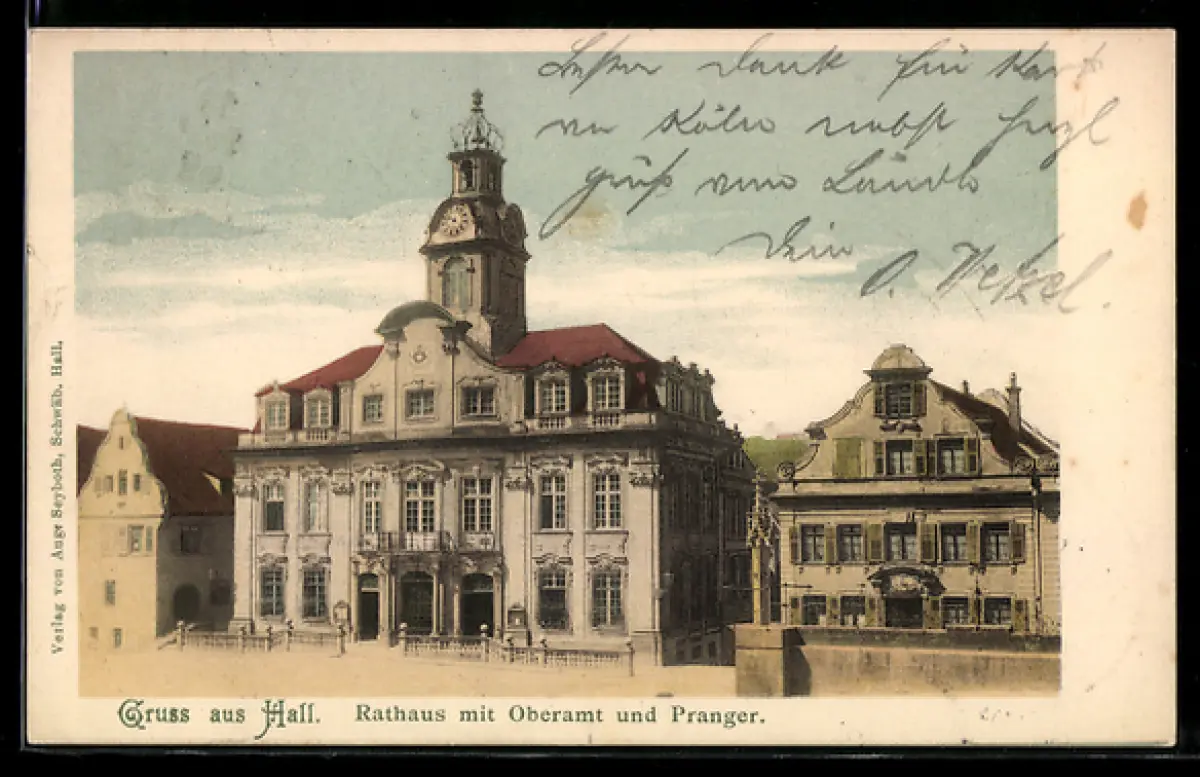 AK Hall, Rathaus, Rathaus mit Oberamt u. Pranger