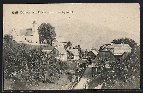 AK Hall / Tirol, Ortsansicht mit Kirche, Reichenstein und Sparafeld