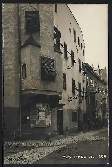 AK Hall i. T., Fleischhauerei Johann Junker, Strassenpartie