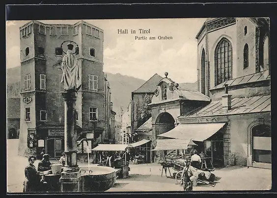 AK Hall in Tirol, Gemüse-Händler, Markz-Stände am Graben