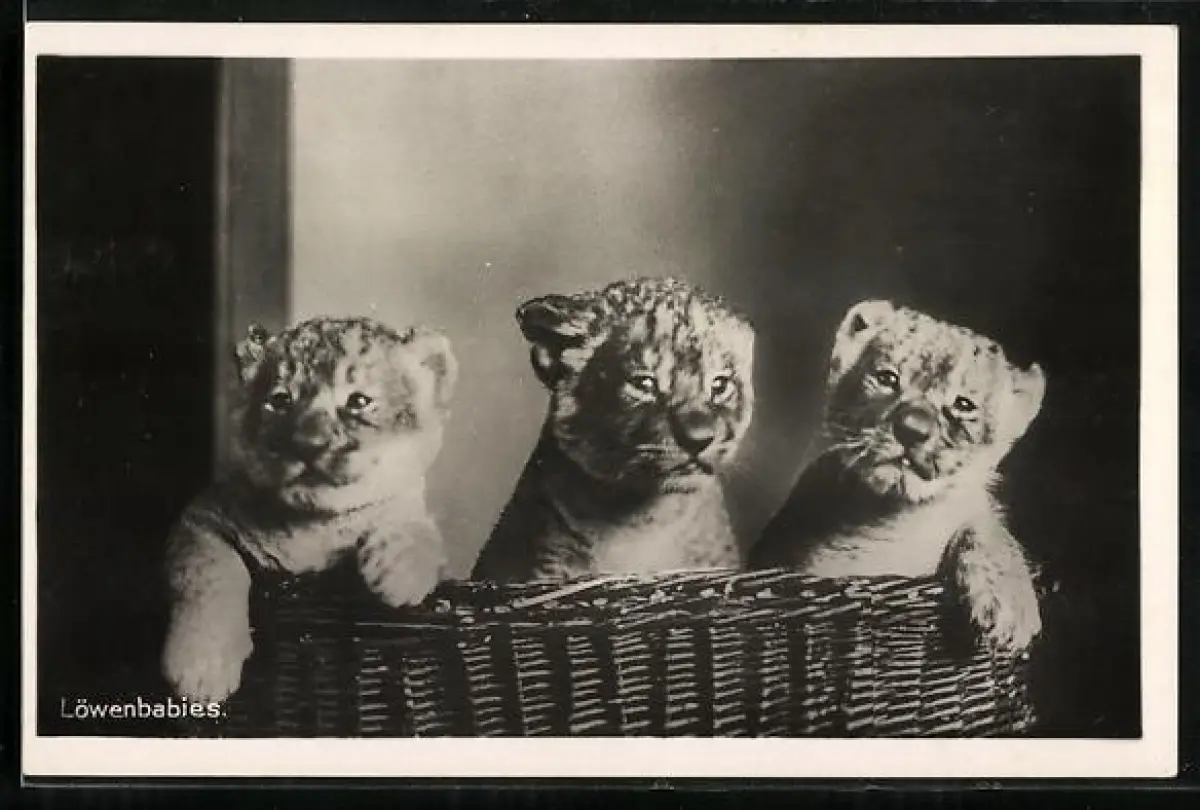AK Halle, Drei Löwenbabies in einem Korb, Zoo