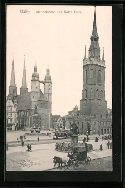 AK Halle, Marienkirche und Roter Turm, Strassenbahn