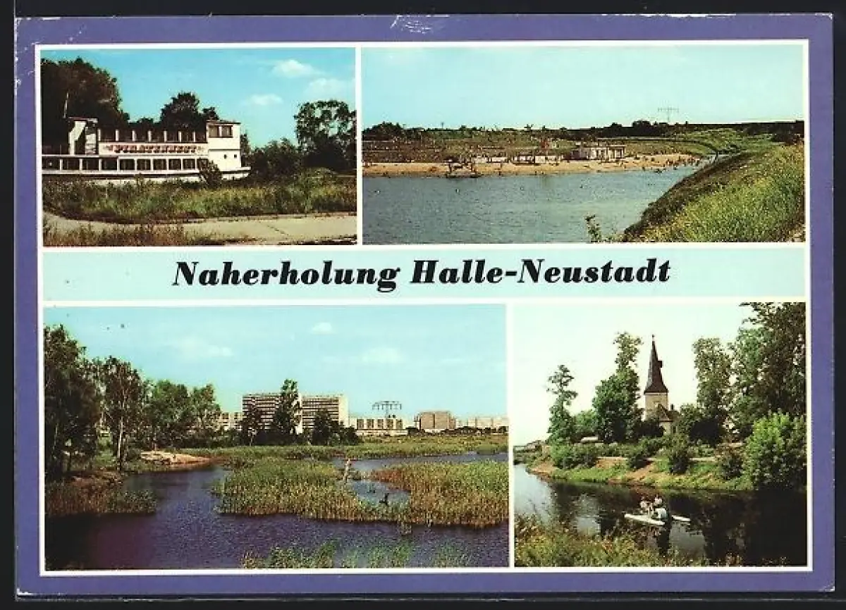 AK Halle-Neustadt, Angersdorfer Teiche, Gaststätte Piratennest, Freibad, Blick auf den Südpark