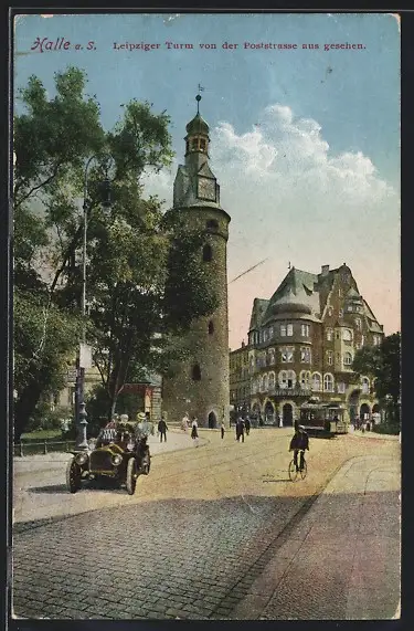 AK Halle /Saale, Leipziger Turm von der Poststrasse aus gesehen mit Strassenbahn und Auto Cabrio