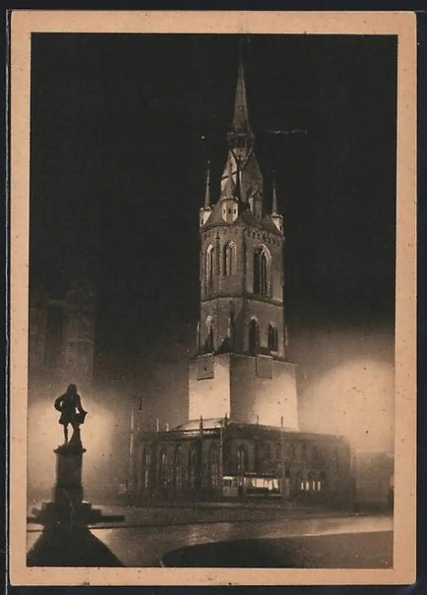 AK Halle /Saale, Roter Turm bei nächtlicher Beleuchtung