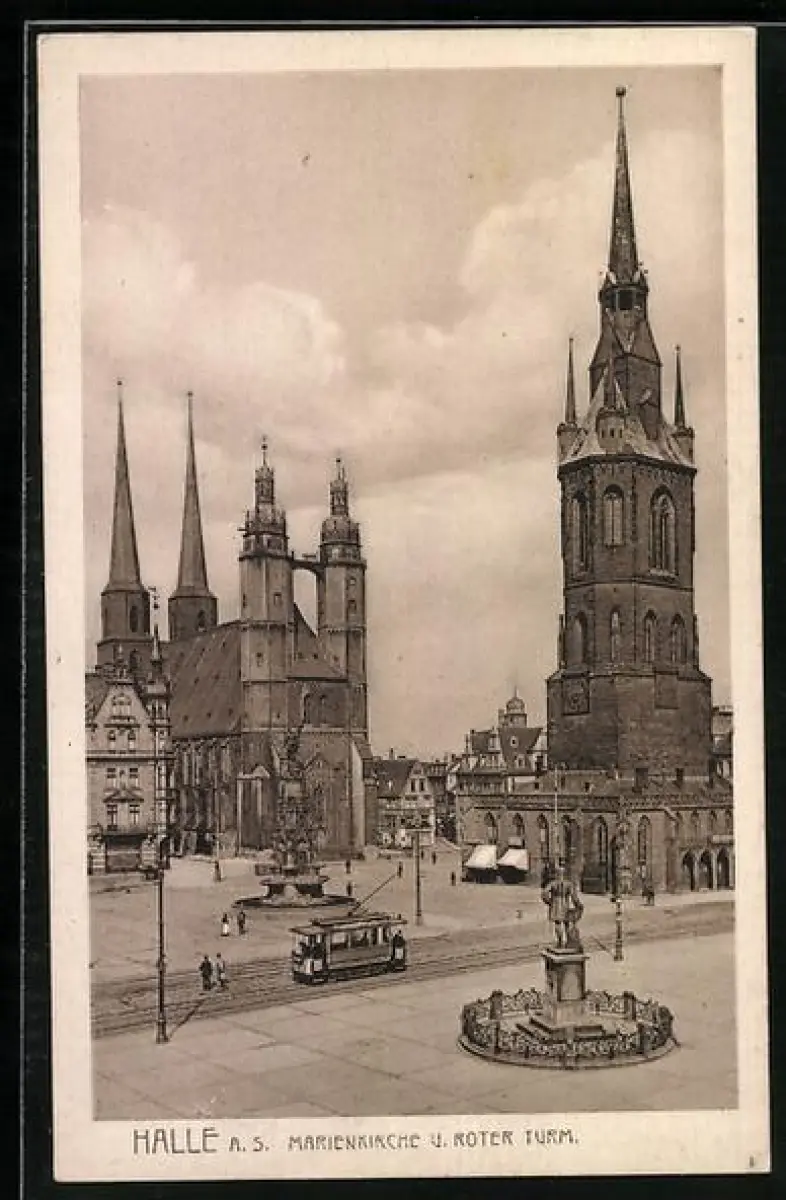 AK Halle a. S., Marienkirche und Roter Turm, Strassenbahn