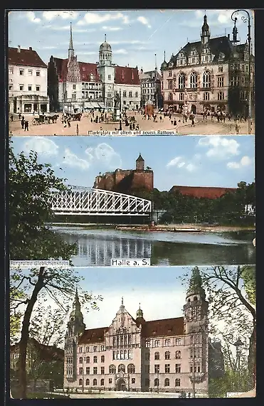 AK Halle a. S., Marktplatz mit altem und neuem Rathaus, Burgruine Giebichenstein, Zivilgericht
