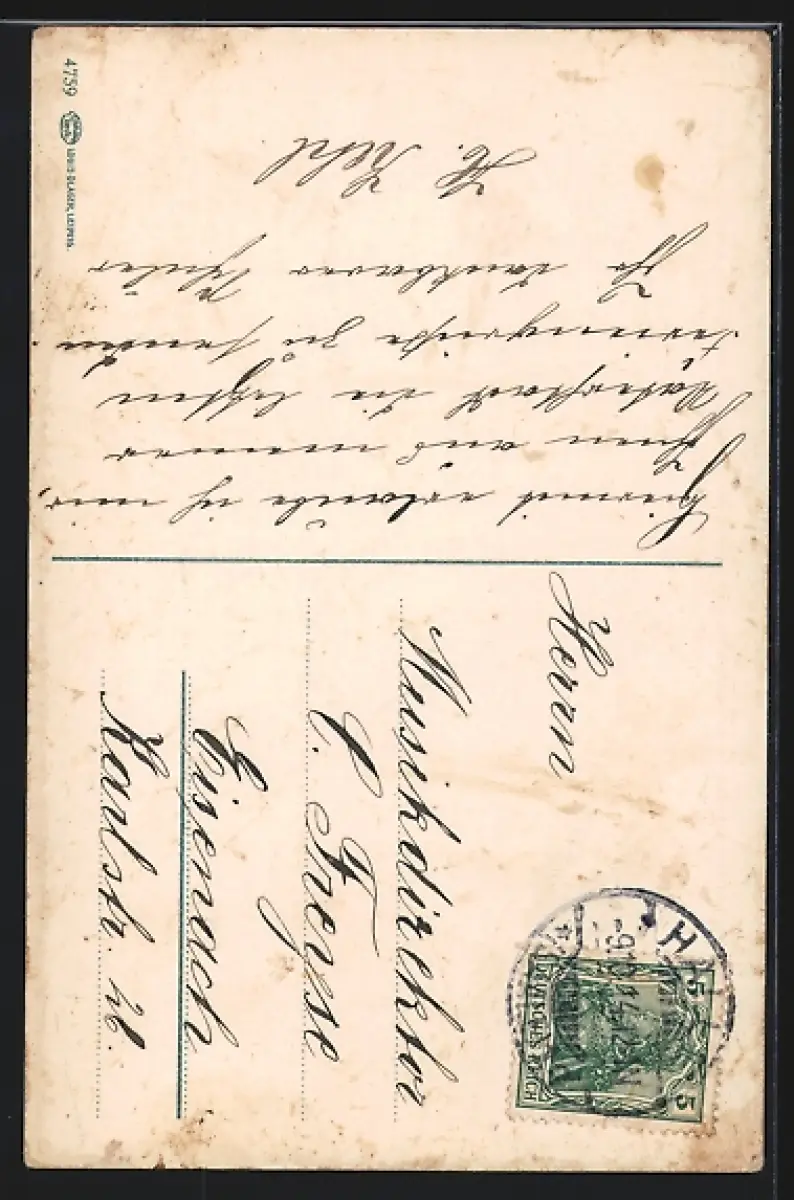 Personenbezogene Daten auf der Rückseite der Karte wurden durch blauen Textmarker unkenntlich gemacht. Die blauen Stellen sind auf die Vorderseite durchgeweicht und wirken sich negativ auf das Postkartenfoto aus