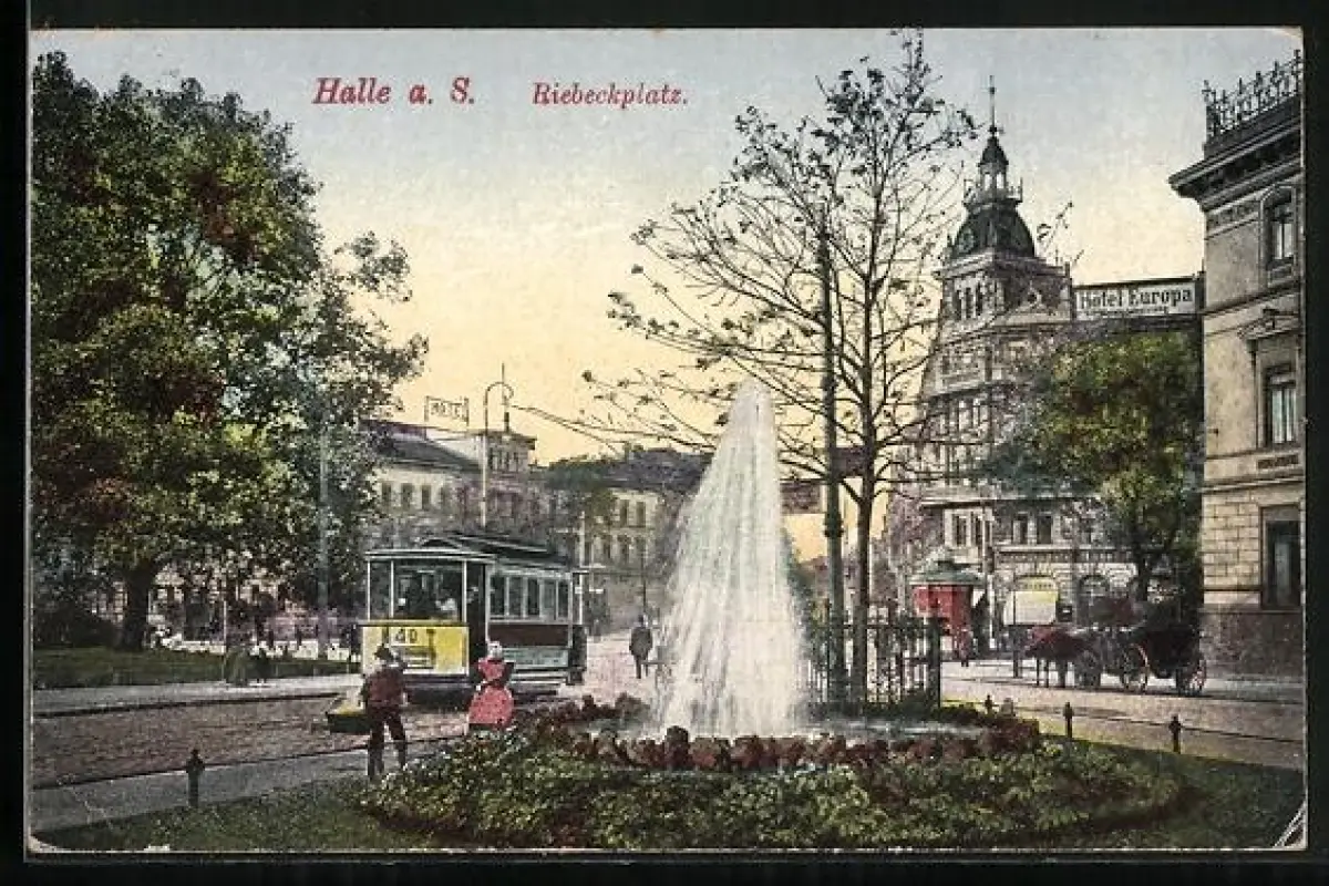 AK Halle a. S., Riebeckplatz mit Fontäne und Strassenbahn