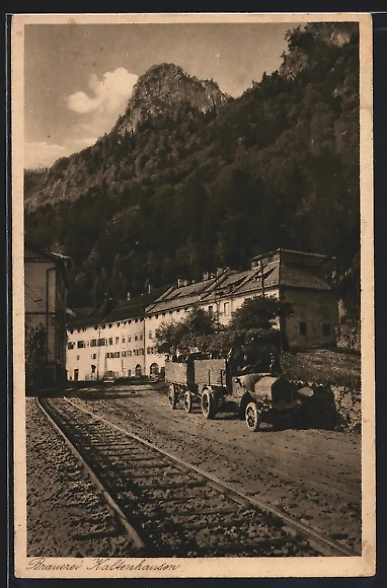 AK Hallein, Brauerei Kaltenhausen, Bahnschienen und Trecker mit Anhängern