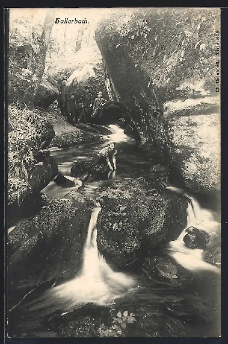 AK Hallerbach, Partie am Bach mit Wanderern