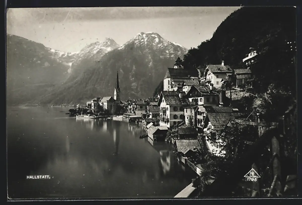AK Hallstatt, Ortsansicht mit See und Bergen