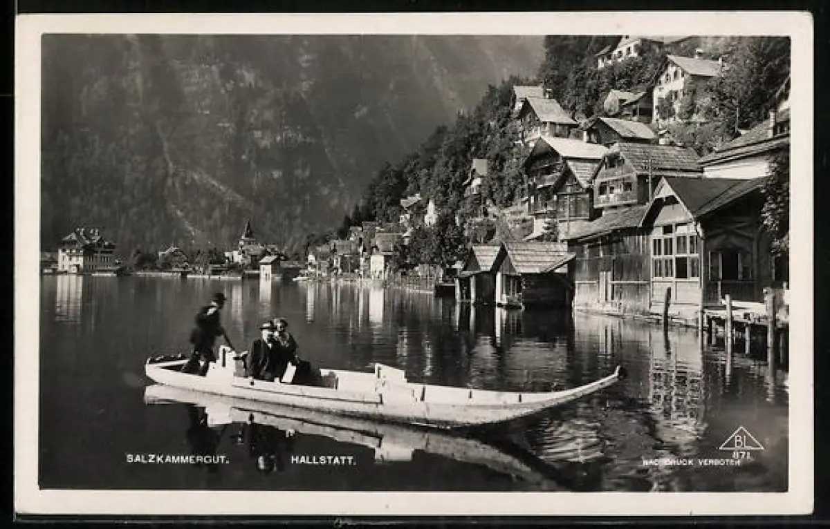 AK Hallstatt /Salzkammergut, Ortspanorama mit Bootspartie