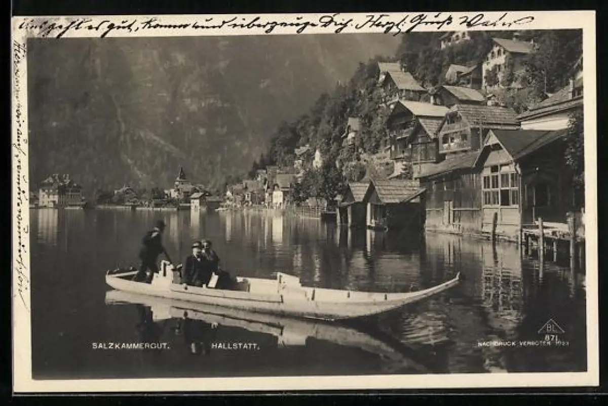 AK Hallstatt /Salzkammergut, Ortspanorama mit Bootspartie