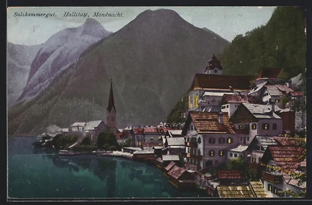 AK Hallstatt, Salzkammergut, Teilansicht in einer Mondnacht