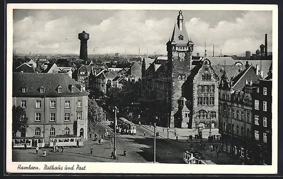AK Hamborn, Blick auf Rathaus und Post mit Strassenbahnen aus der Vogelschau