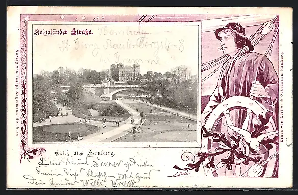 AK Hamburg, Blick über die Helgoländer Strasse, Passepartout mit Seemann