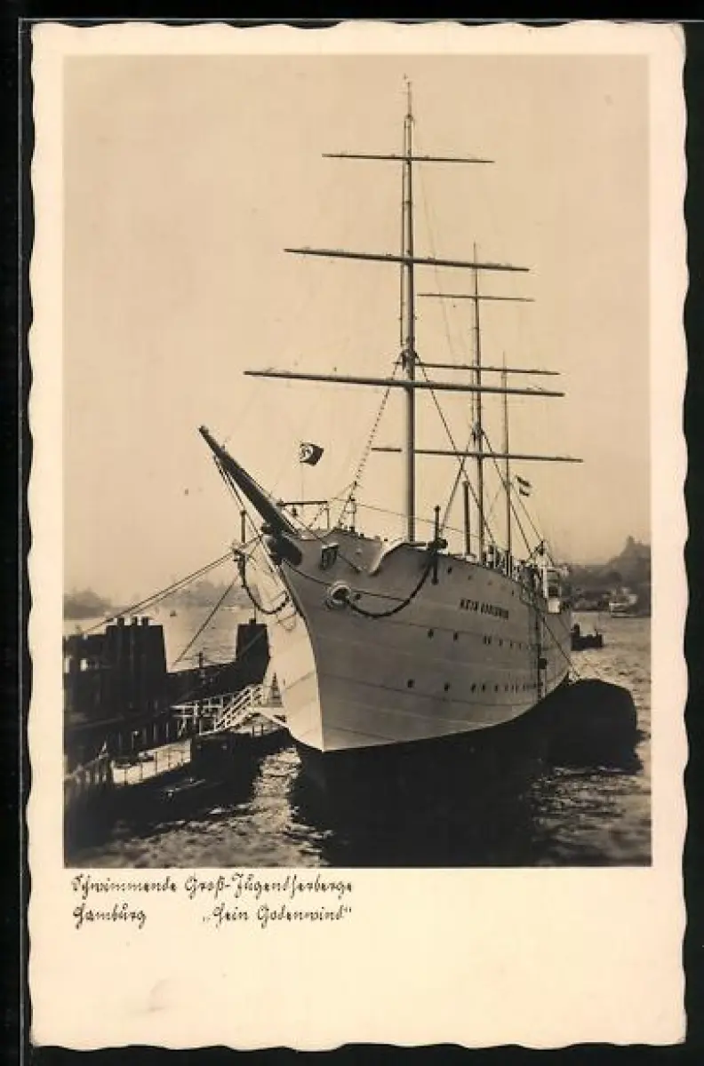 AK Hamburg, Die schwimmende Gross-Jugendherberge Hein Godenwind im Hafen gesehen, Segelschiff
