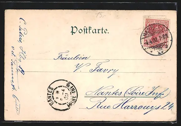 gelaufen 1902, Eckknick oben re., Bugspur re. mittig, guter Zustand