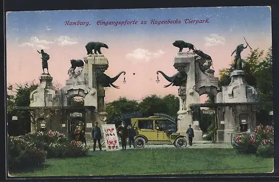 AK Hamburg, Eingangspforte zu Hagenbecks Tierpark mit Auto