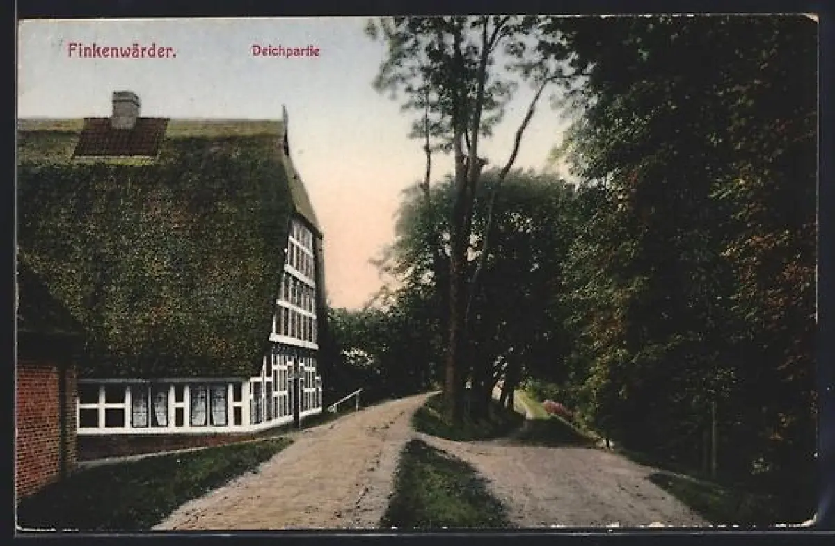 AK Hamburg-Finkenwerder, Deichpartie mit Reetdachhaus