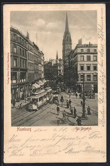 AK Hamburg, Hamburger Strassenbahn Linie 70, Gr. Burstah, Blick auf die Kirche, Unfallversicherung Viktoria
