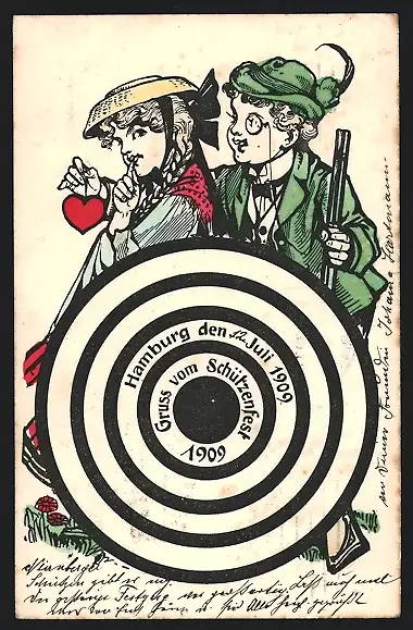 AK Hamburg, Jäger mit seiner Liebsten hinter einer Zielscheibe, Schützenfest 1909
