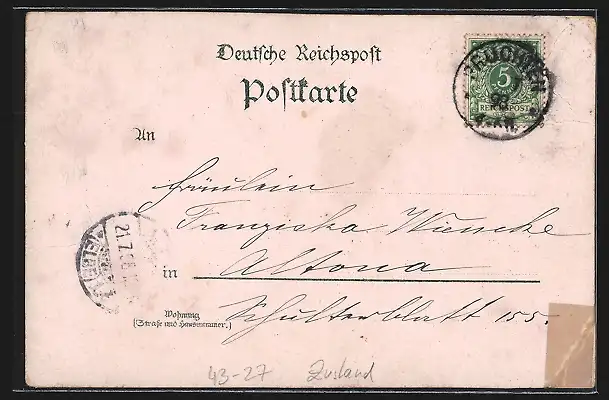 Personenbezogene Daten auf der Rückseite der Karte wurden durch blauen Textmarker unkenntlich gemacht. Die blauen Stellen sind auf die Vorderseite durchgeweicht und wirken sich negativ auf das Postkartenfoto aus