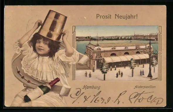 AK Hamburg-Neustadt, Alsterpavillon, Kind mit Sektflasche, Neujahrsgruss