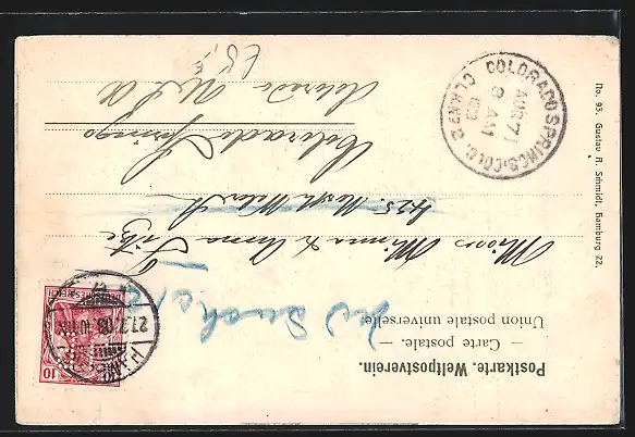 Personenbezogene Daten auf der Rückseite der Karte wurden durch blauen Textmarker unkenntlich gemacht. Die blauen Stellen sind auf die Vorderseite durchgeweicht und wirken sich negativ auf das Postkartenfoto aus