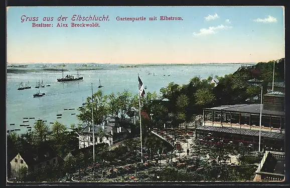 AK Hamburg-Othmarschen, Gasthaus Elbschlucht, Gartenpartie und Elbstrom mit Dampfer